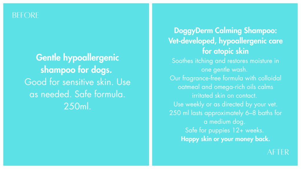 I can’t emphasize it enough: product copy plays a crucial role in successful pet marketing. Consider this before-and-after description for hypoallergenic shampoo for dogs with atopic dermatitis.