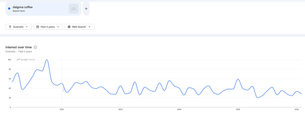 For example, “dalgona coffee” experienced a surge in interest around 2020-2022, but has been fluctuating downwards ever since.
