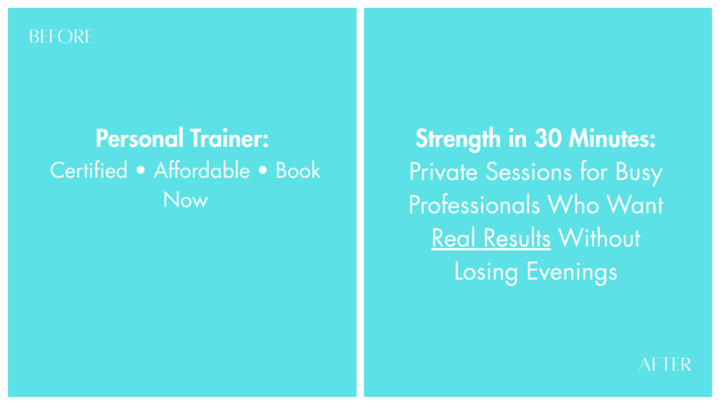 For example, consider the before and after of this personal trainer’s website headline. Strip away all visual branding and you’ll see what a difference voice and copy make.